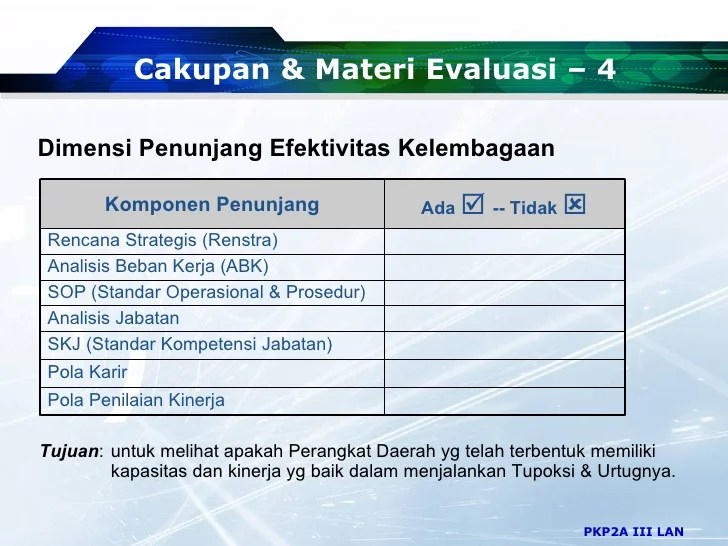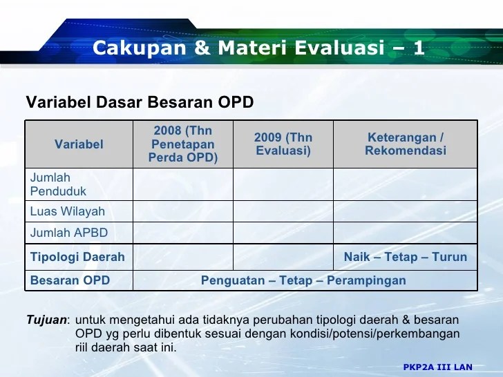 Organisasi perangkat daerah (lembaran negara republik. (1) pelaksanaan evaluasi kelembagaan instansi pemerintah. Indonesia tahun 2017 nomor 106,. Dilaksanakan pada proses reorganisasi atau evaluasi kelembagaan tahun 2011. (contoh format laporan hasil evaluasi lakip lihat lampiran 3).
